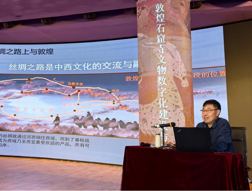 第一场讲座题为《丝路永存——敦煌石窟寺文物数字化建设与研究》。李成老师围绕丝绸之路上的敦煌展开,首先宏观地介绍了敦煌莫高窟的地理位置、建造历史及其在文化上的重要价值。