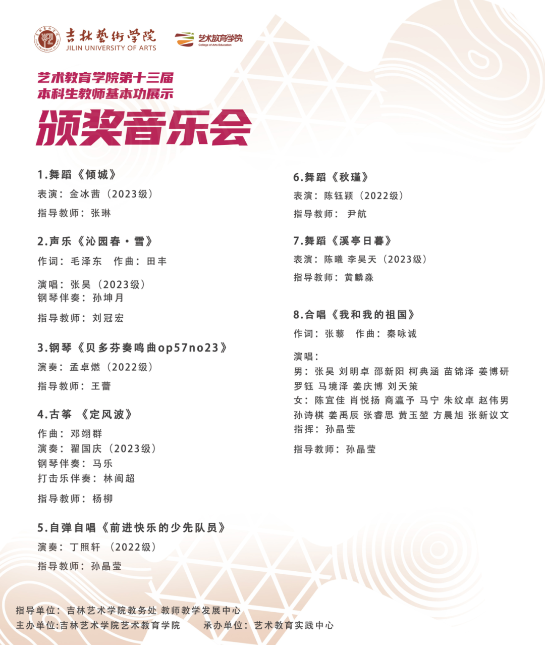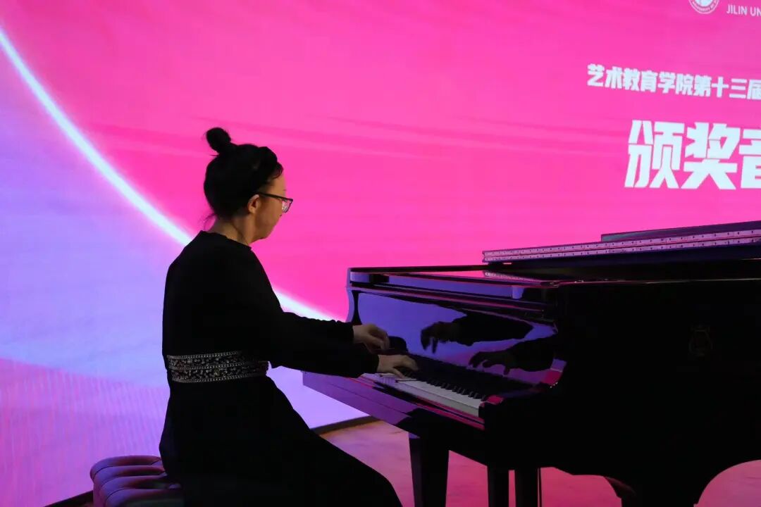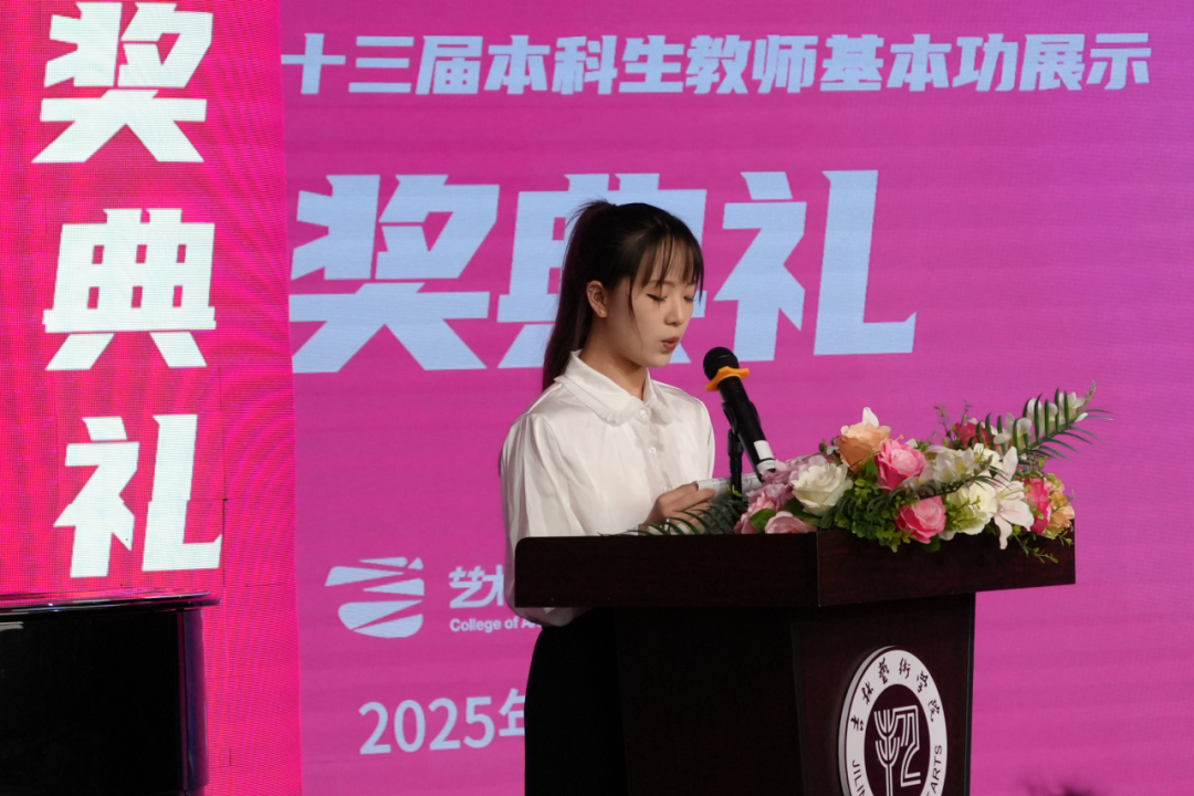 教学副院长涂蓓:“艺术教育学院第十三届本科生教师基本功展示活动是学院全体教师和学生共同努力坚守了十三届的教学品牌活动,是展示教师教学成果和人才培养质量的重要窗口,致力于培养教育情怀浓厚、专业基础扎实、勇于创新教学、善于综合育人的美育教师,而本次教师基本功展示活动正是对本科生专业素养和教学能力的一次全面检验,比赛参与学生总人数297人,通过以赛促学、以赛促教的方式,全面展示了各专业的综合素质、专业水平和实践能力。展示内容包括声乐、钢琴、器乐、微课、舞蹈、自弹自唱、合唱指挥、硬笔书法,软笔书法,速写、命题创作、舞蹈剧目、舞蹈编创。从初赛、复赛至颁奖典礼,历时五个月时间,选手们用歌声传递着情感与力量,用指尖弹奏出对音乐最纯粹的热爱、用汗水书写对作品创作的激情、用舞步跳出舞动的青春、将教与学有效结合,彰显了艺术教育学院教学团队的育人成效,有助于营造积极向上、追求卓越的教学氛围。”