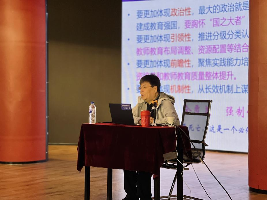 李广平教授系统分析了教育强国战略需求下,应对新时代高等教育和基础教育高质量发展新局面,国家对教师教育体系重构的新要求,着重解读了《中共中央国务院关于弘扬教育家精神加强新时代高素质专业化教师队伍建设的意见》和中共中央国务院《教育强国建设规划纲要(2024 - 2035 年)》中关于“健全中国特色教师教育体系”的相关内容,使我院教师充分认识到“优化师范院校评估指标,改革师范类专业认证”“推进培养模式改革”“推动高水平大学开展教师教育,提高师范教育办学质量”是当今教育转型形势下的常态工作。