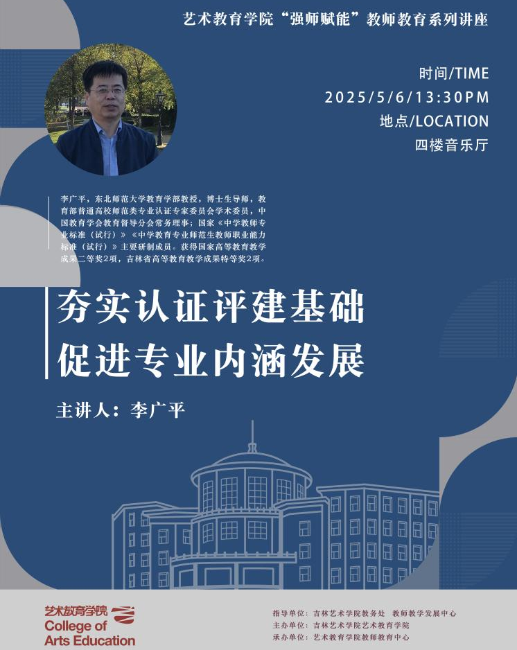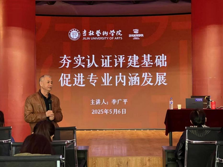 为全力推动师范类专业认证工作全面、有序、深入开展,确保艺术教育学院能够以全新的面貌迎接教育部专家进校,并使我院美术学(师范)专业顺利通过认证,5月6日下午1:30分,特邀东北师范大学教育学部博士生导师,教育部普通高校师范类专业认证专家委员会学术委员,中国教育学会教育督导分会常务理事李广平教授在学院四楼音乐厅进行《夯实认证评建基础,促进专业内涵发展》专题讲座。会议由艺术教育学院教师教育中心主任曹华主持。