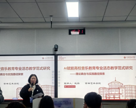 在“AI时代音乐教学改革”分论坛中,艺术教育学院赵扬老师以《AI赋能高校音乐教育专业活态教学范式研究》为题分享研究成果。她深入探索人工智能技术与活态教学理念的融合路径,通过厘清AI 在音乐活态教学中的适配性,构建包含教学目标动态调整、教学内容智能生成、教学场景虚实融合及教学评价多维反馈的活态教学范式,并提出实践策略。该研究丰富了教育技术学与音乐教育学的交叉研究成果,为高校音乐教育专业的数字化转型提供了理论依据与实践框架,对提升教学质量、培养具备音乐创造力与文化传承能力的人才具有重要意义,引发了在场学者对AI赋能活态教学问题的高度关注。