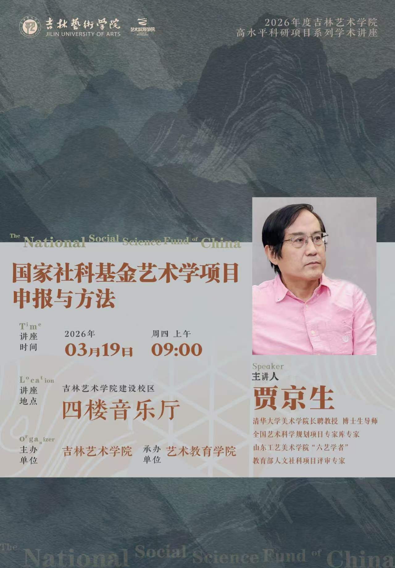 为深入推动艺术教育学院高质量发展,切实提升我院教师科研申报能力,助力高水平科研项目精准培育,3月19日上午,吉林艺术学院2026年度高水平科研项目系列学术讲座在建设校区四楼音乐厅开讲。本次讲座特邀清华大学美术学院贾京生教授作《国家社科基金艺术学项目申报与方法》专题分享,各分院教师代表到场参会,讲座由艺术教育学院承办。